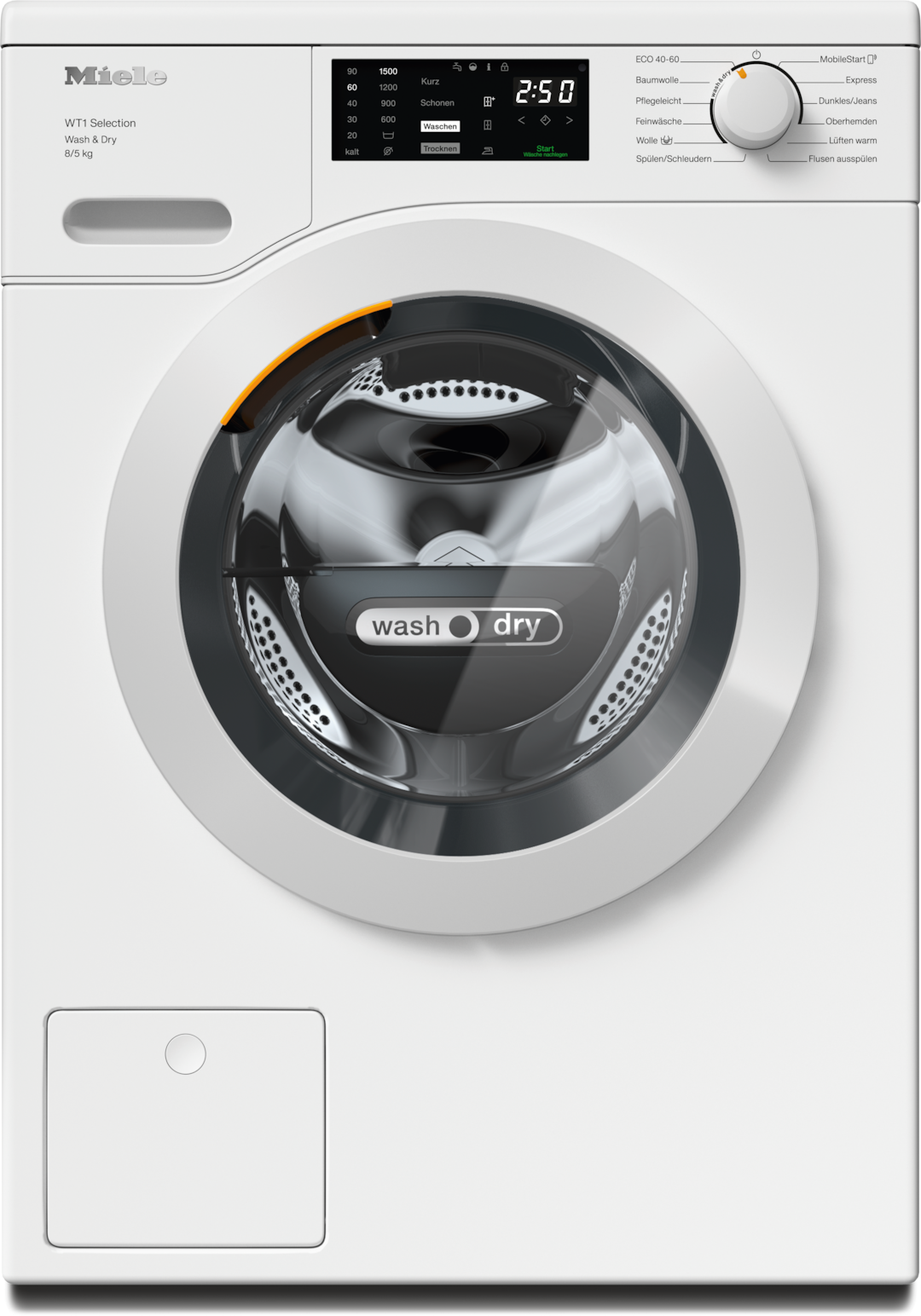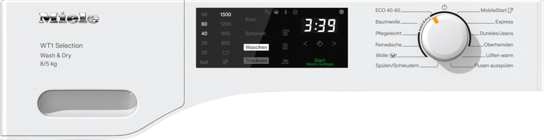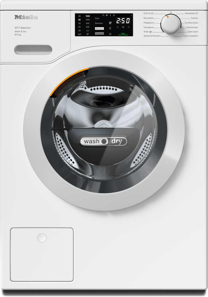 - 4.Während der Entwicklungsphase der Waschtrocknerserie WT1 hat Miele Modelle & Kernkomponenten mit 5000 Wasch- und 4000 Trockengängen (= 5 Wasch- und 4 Trockengänge p. Woche für 50 Wochen p.a.) in div. Programmen getestet. Mehr: miele.com/20years
