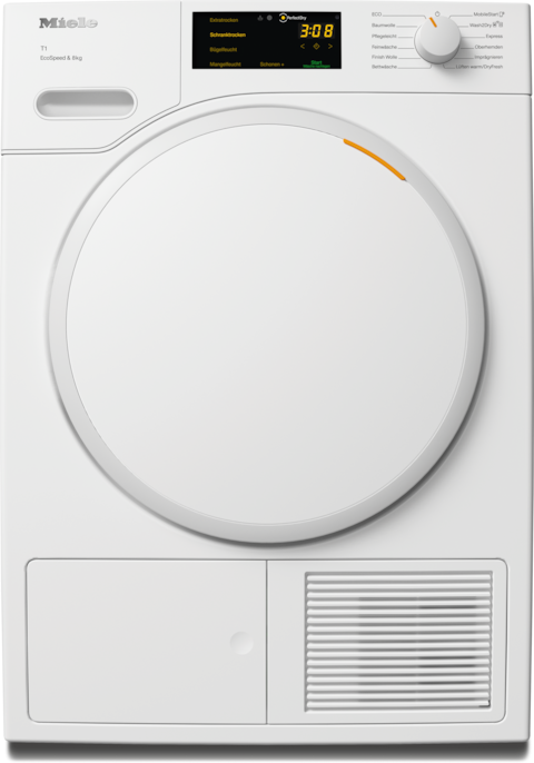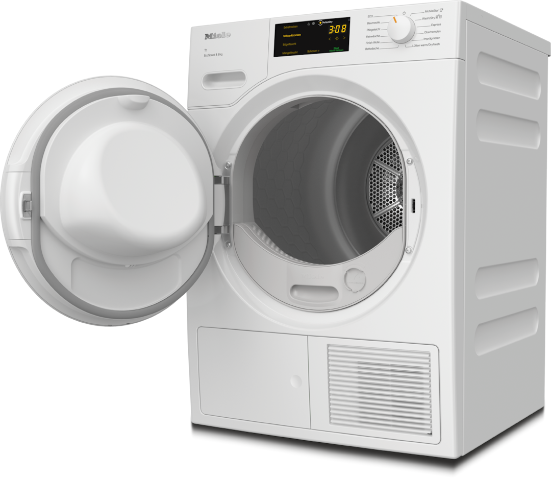 - 4.Zeitersparnis berechnet im Vergleich zu Miele Trocknern ohne EcoSpeed bei gleicher Beladungsmenge und vergleichbarer Energieeffizienz. Getestet im Programm "Baumwolle" bei voller Beladungsmenge.