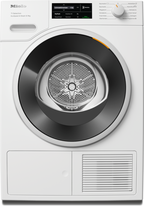 - 4.Zeitersparnis berechnet im Vergleich zu Miele Trocknern ohne EcoSpeed bei gleicher Beladungsmenge und vergleichbarer Energieeffizienz. Getestet im Programm "Baumwolle" bei voller Beladungsmenge.
