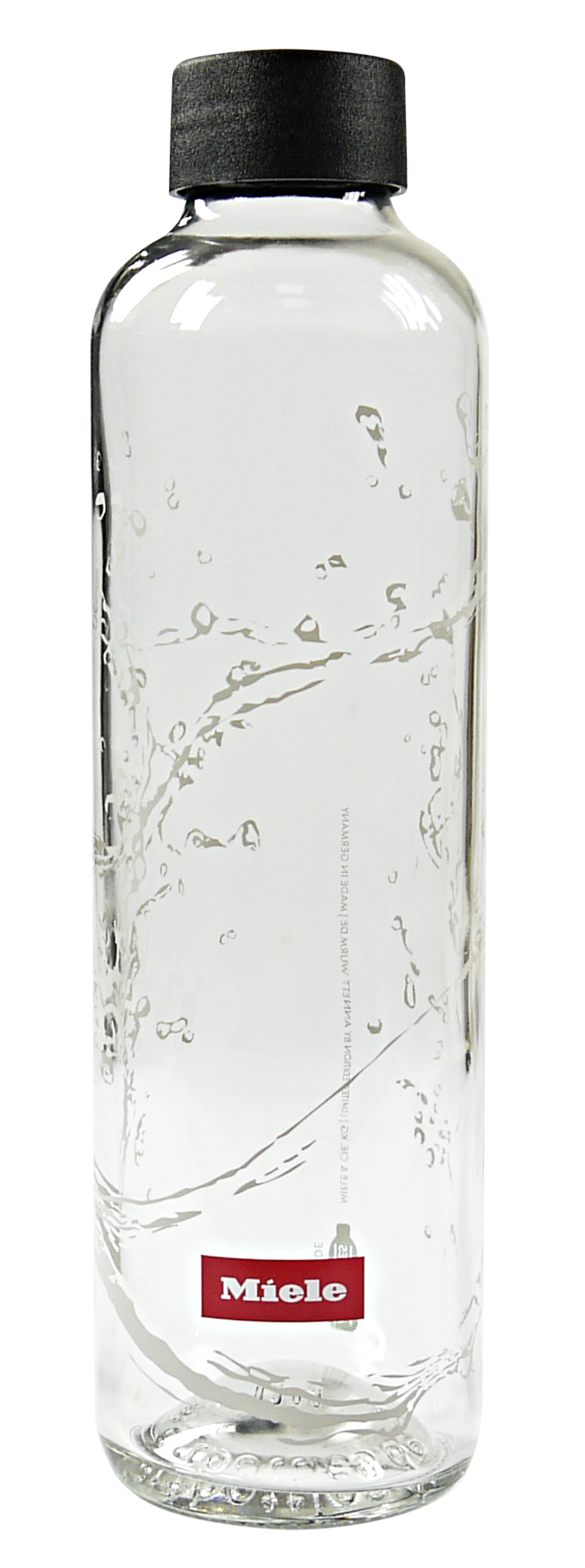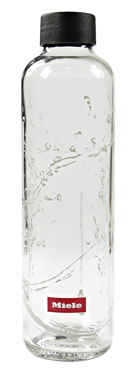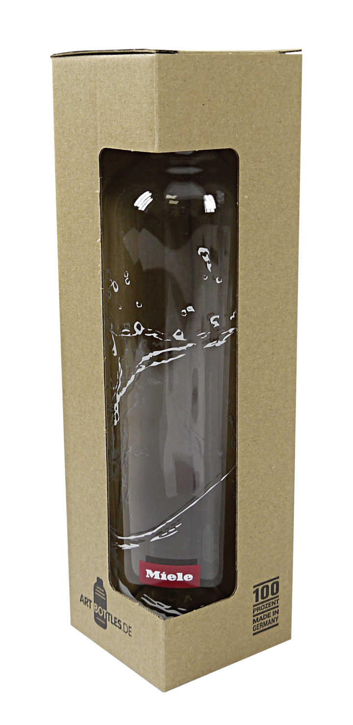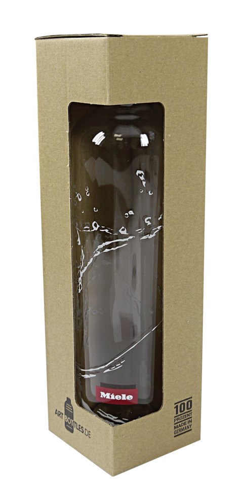 Kunstvoll gestaltete Glasflasche mit Miele Logo
