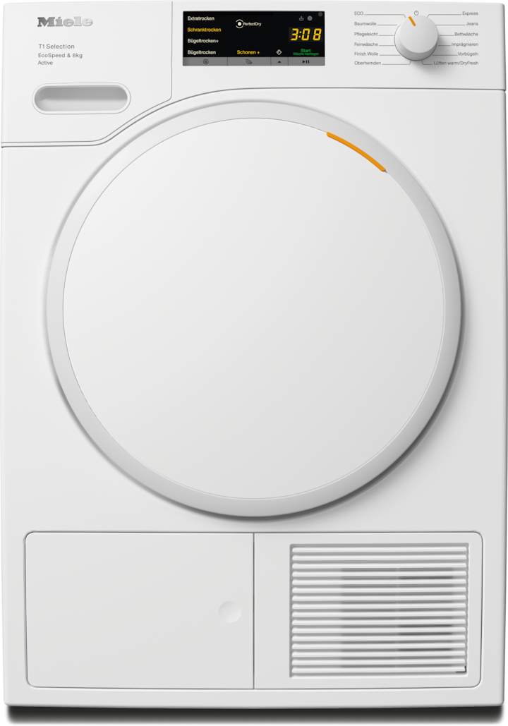 - 4.Zeitersparnis berechnet im Vergleich zu Miele Trocknern ohne EcoSpeed bei gleicher Beladungsmenge und vergleichbarer Energieeffizienz. Getestet im Programm "Baumwolle" bei voller Beladungsmenge.