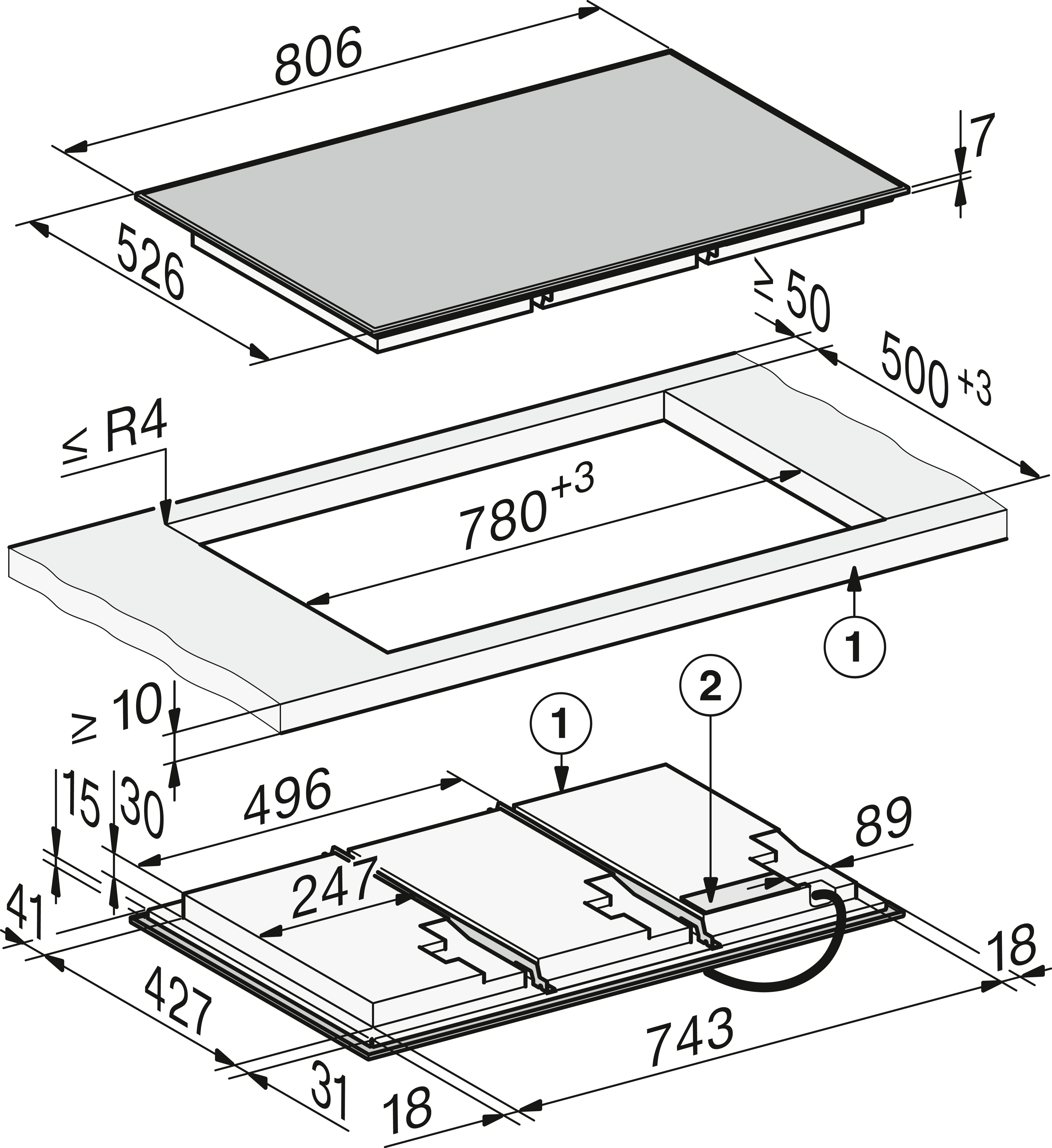 - In 806 mm Breite mit Edelstahlrahmen für aufliegenden Einbau
